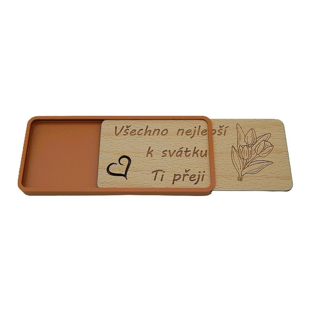 Dárková kazeta na peníze. Vytištěno na 3d tiskárně. Výsuvná deska s gravírovaným textem a grafikou z bukové překližky síly 4 mm. Rozměry dle tvaru až 204 x 96mm. Možnost různého textu, grafiky a různé barevné provedení krabiček.