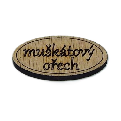 Dřevěná cedulka ke koření. Rozměr 3,5 x 1,5 cm. Vyrobeno z bukové překližky síly 4mm. Možnost individuální zakázky.